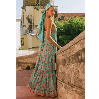 Robe longue à col en V et bretelles spaghetti à imprimé tropical