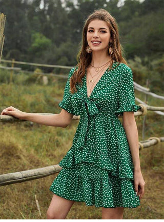Robe longue à bretelles spaghetti à imprimé végétal et à volants noués